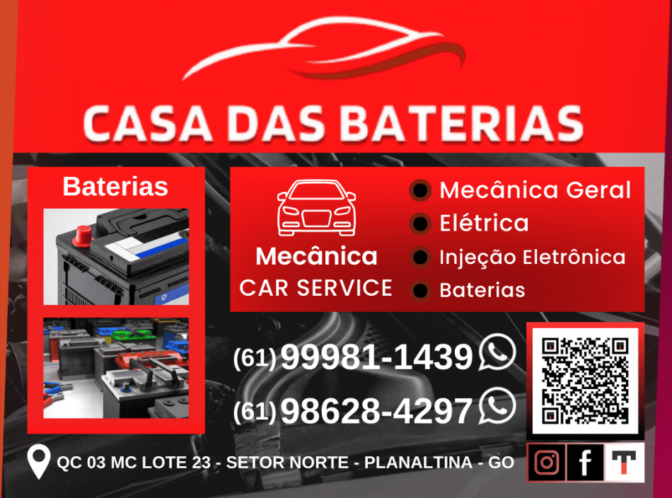 “Baterias e serviços mecânicos, pronto atendimento! É só ligar, atendemos em domicílio. Casa das Baterias.