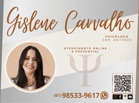Gislene Carvalho – Psicóloga – AUTÔNOMA – PLANALTINA – GO – BR 13 de abril de 202513 de abril de 2025João CelestinoSem comentáriosCompartilhe com o mundo! ⇓ Citação (frase) “Compromisso, descrição e profissionalismo, atendimento presencial e online. Gislene Carvalho – Psicóloga. ⇓…