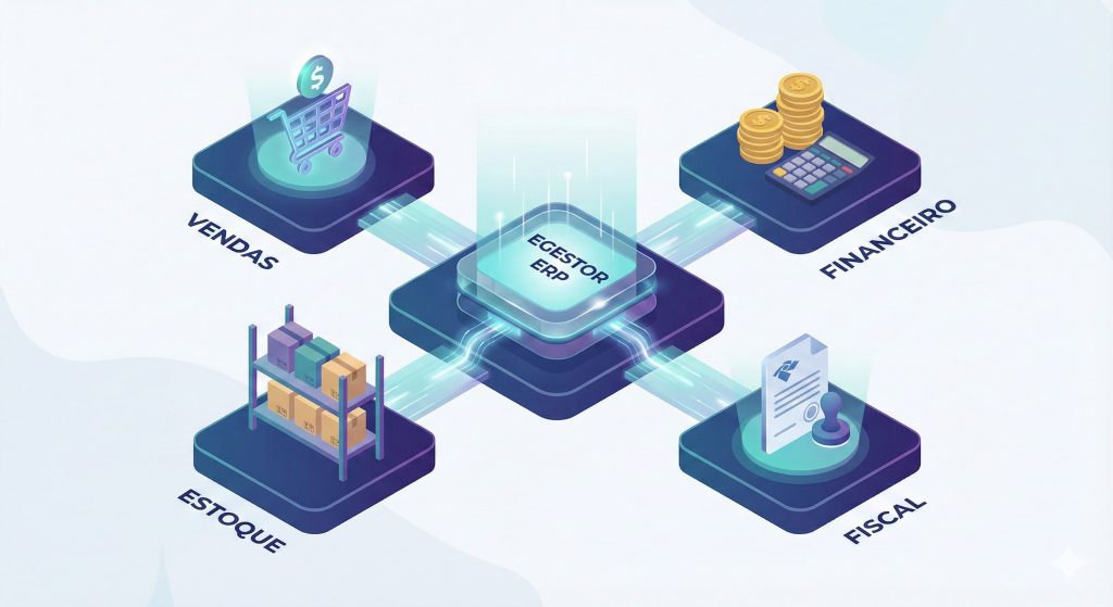 Ele integra vendas, compras, financeiro, estoque e emissão fiscal em uma única tela. É a diferença entre “achar” que está lucrando e saber exatamente quanto dinheiro sobrou no fim do mês.