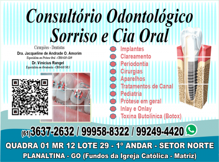 Consultório Odontológico Sorriso e Cia Oral – Dentista – EMPRESA – PLANALTINA – GO – BR 13 de junho de 201526 de janeiro de 2025João CelestinoSem comentáriosCompartilhe com o mundo! ⇓ Citação (frase) “Especialistas em Próteses Oral e Ortodontia, você será avaliado com responsabilidade e terá…