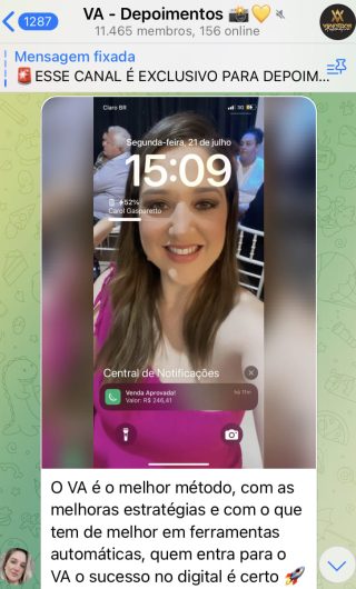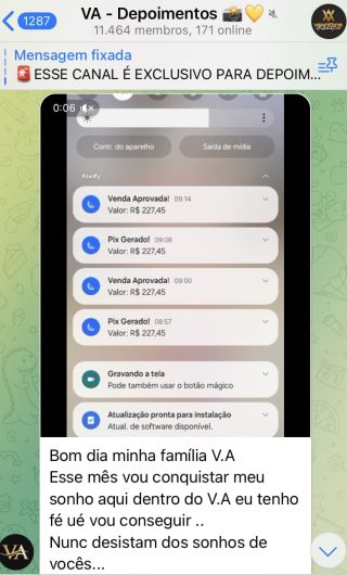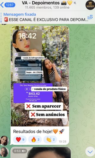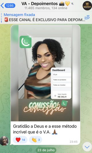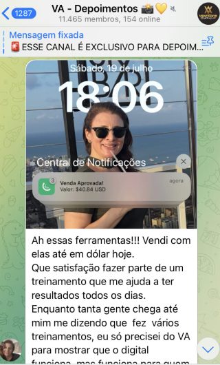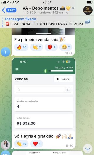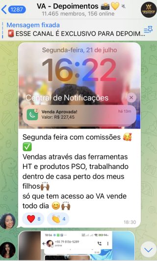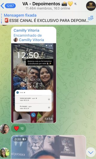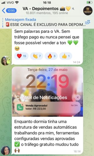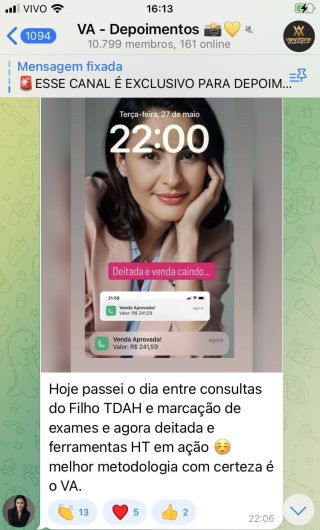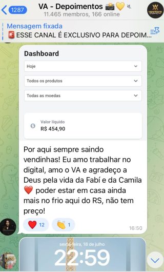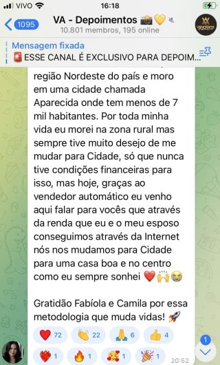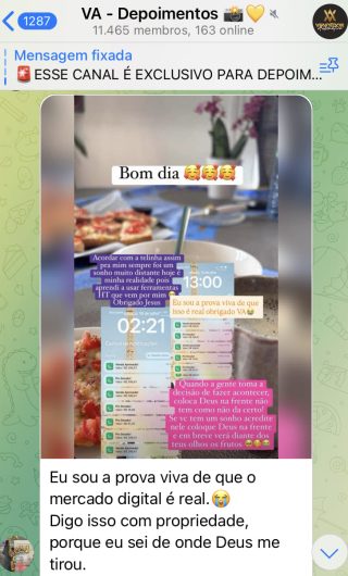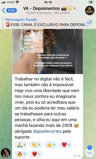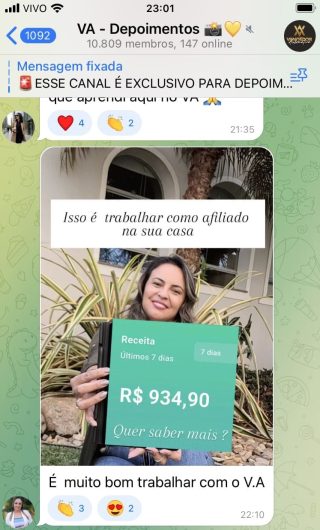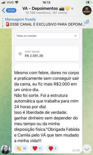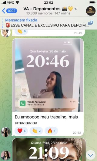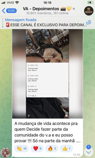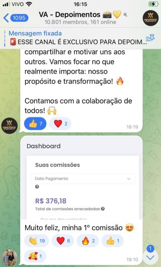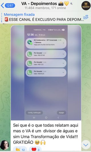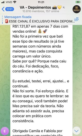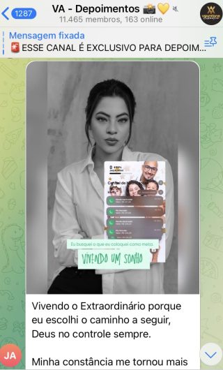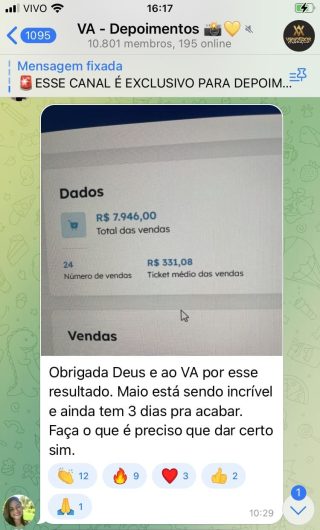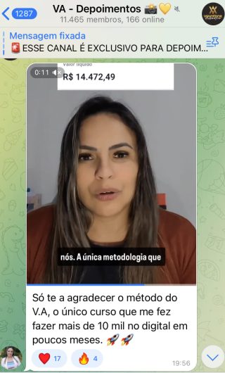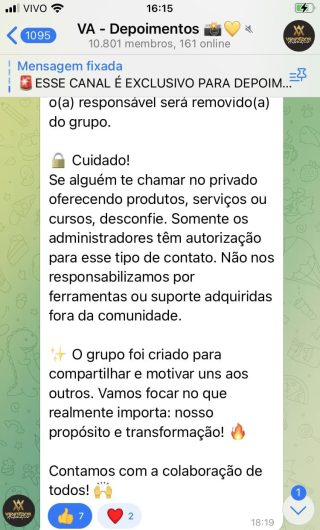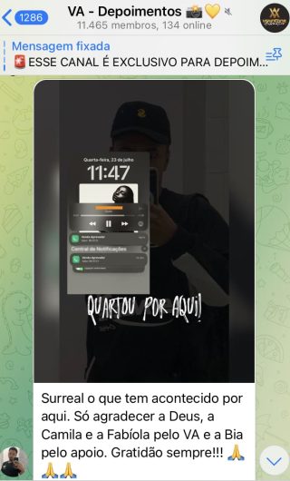 O VA tem até 3 canais: O primeiro de Depoimentos com mais de 10.000 membros, onde postam os seus resultados, são milhares mas separamos 146 resultados abaixo de forma variada e aleatória; o segundo de Avisos para as comunicações aos membros; o terceiro de Suporte para apoiar no desenvolvimento dos membros da comunidade. Achamos toda essa estrutura disponibilizada como um auto grau de transparência e profissionalismo, é do tipo pegar na mão e conduzir, apoiar.